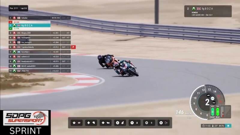 In Supersport it was the battle between Conner and Kalan that was in everyone’s lips. There wasn’t much between them in practice. In qualifying it was Conner who took pole with a 1:48.769 however he would later receive a three place grid penalty for gaining a significant time advantage by overshooting the line so that promoted Kalan to pole position. Mogzy one of the pre season favourites only made it to race day and he and his Satelitte counterpart Shay both starting from the back of the grid due to missing qualifying. It was set up for a brilliant sprint race.